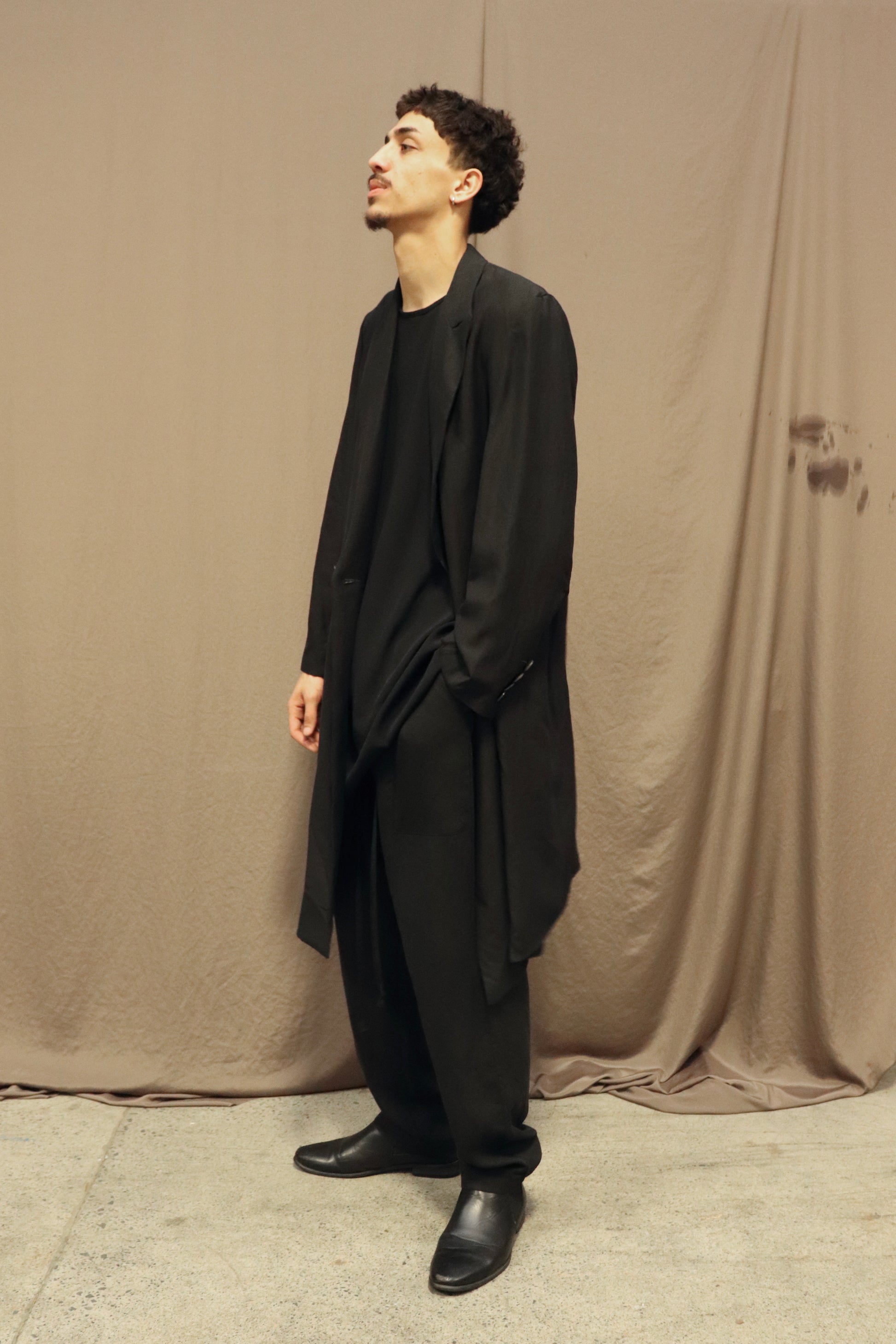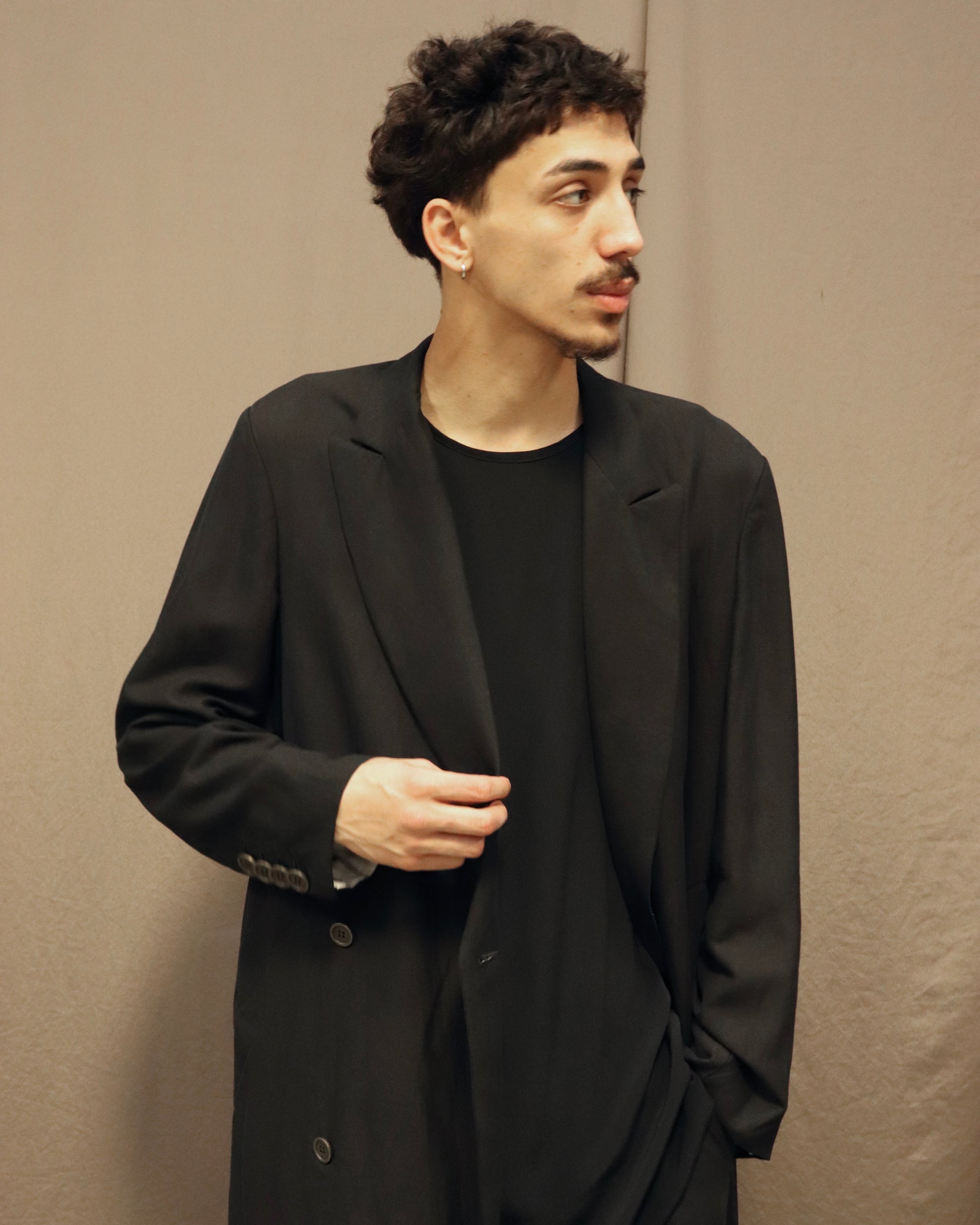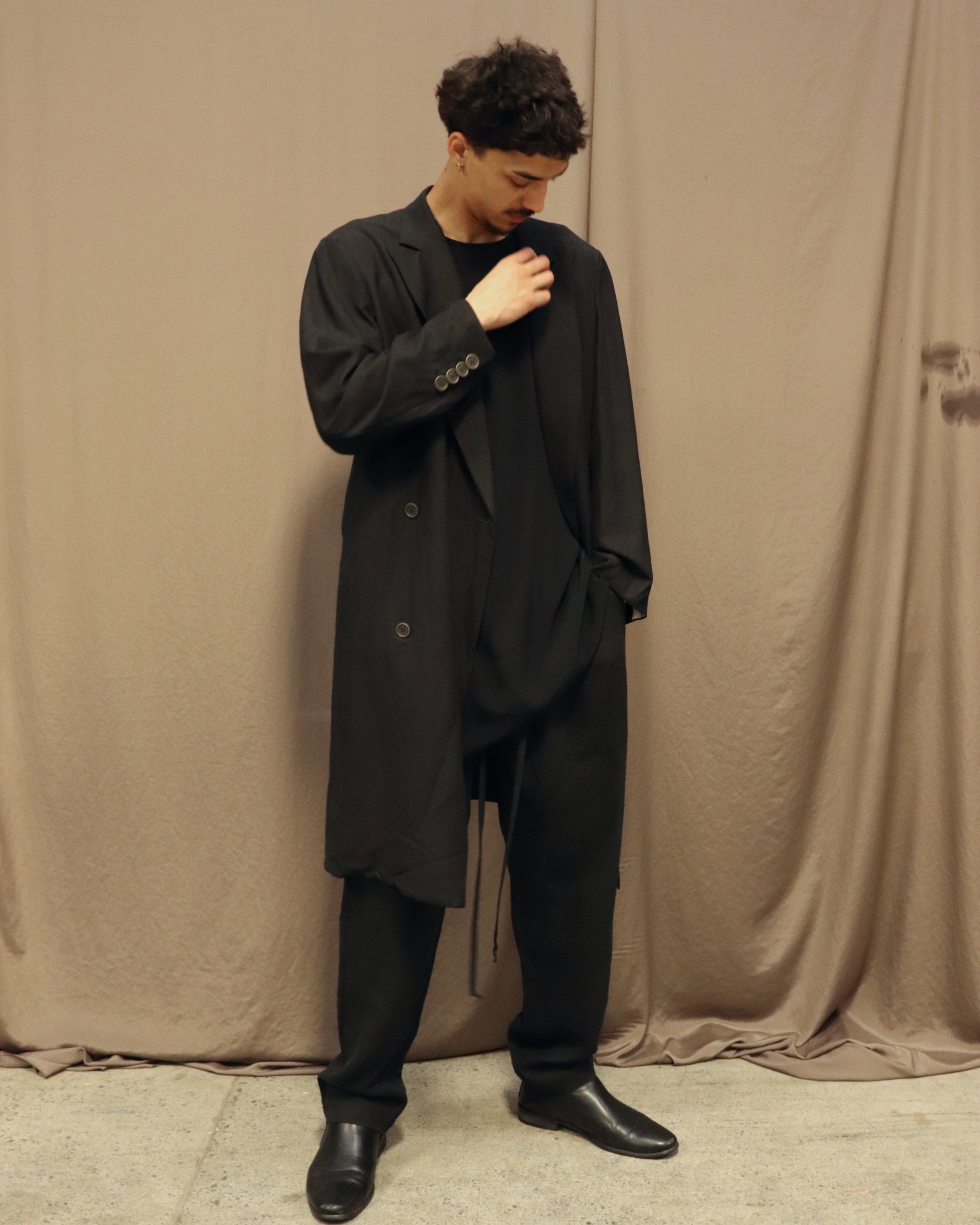 This black double-breasted coat with peak lapels is crafted from a silk-linen blend. It includes a distinctive striped eucalyptus sleeve lining and a lightweight crinkle lining inside. As this garment is produced on order, please reach out to discuss sizing arrangements.