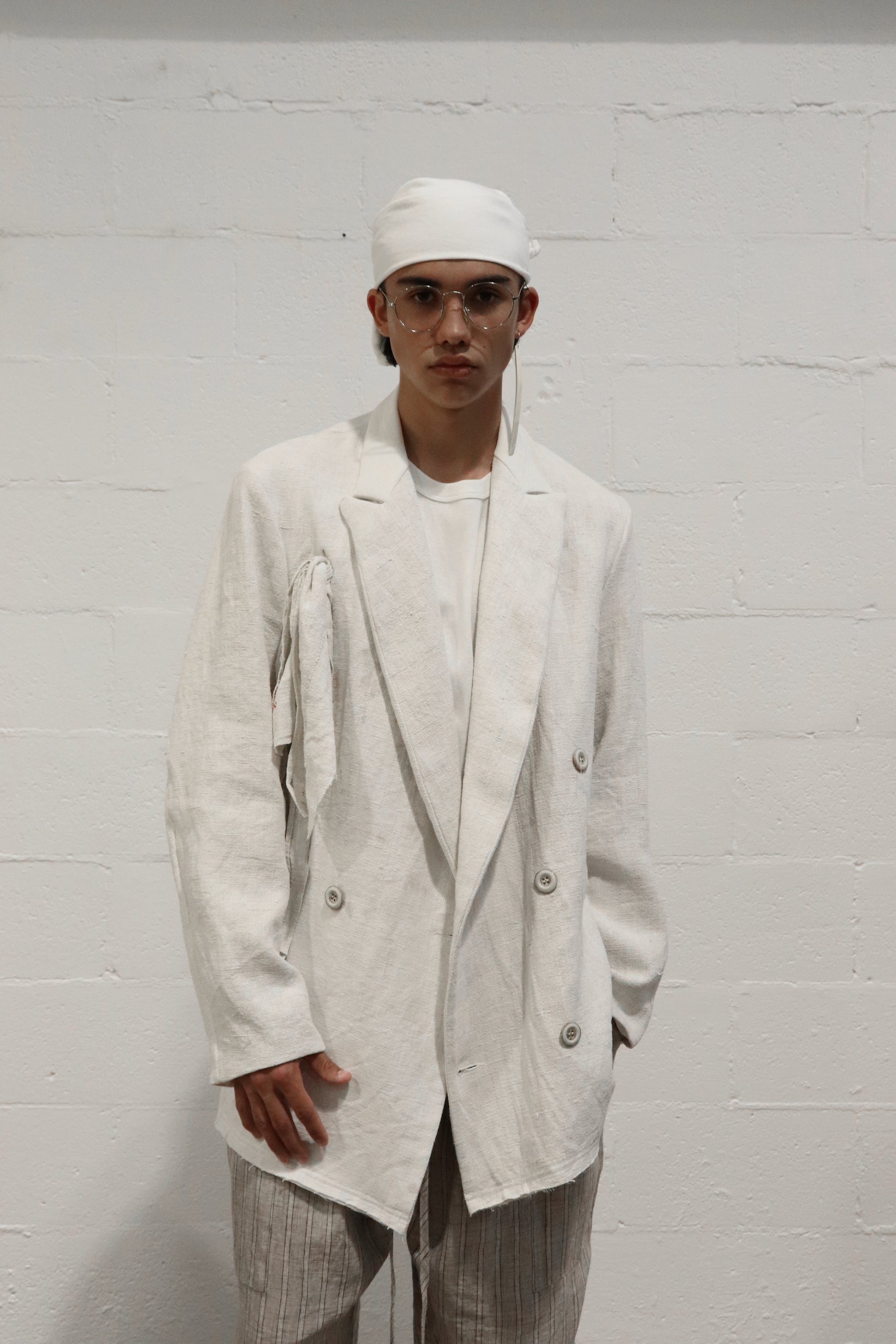 Iteration: This materials from this jacket were sourced from an antique fabric supplier Jeanne Valet in Daikanyama, Tokyo. Includes a contrast cotton canvas top collar and pinned fabric appliqué.