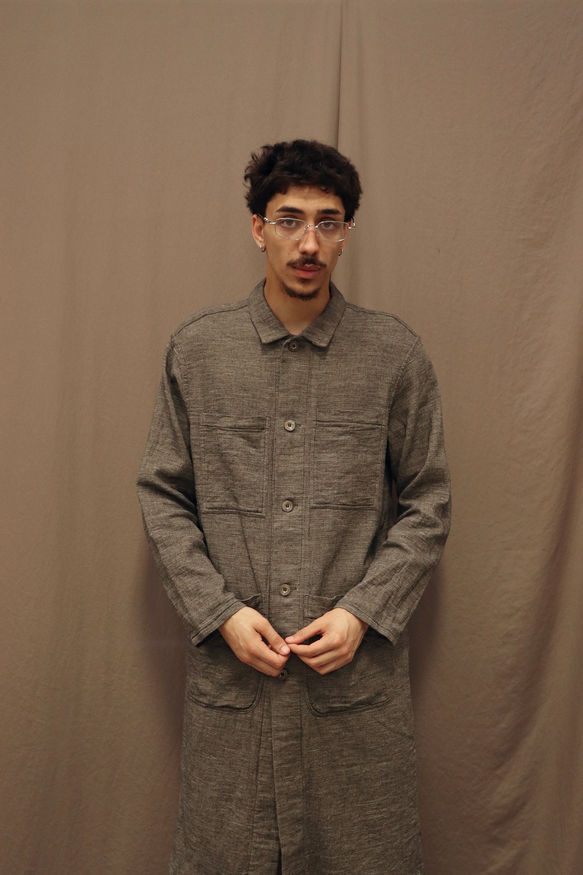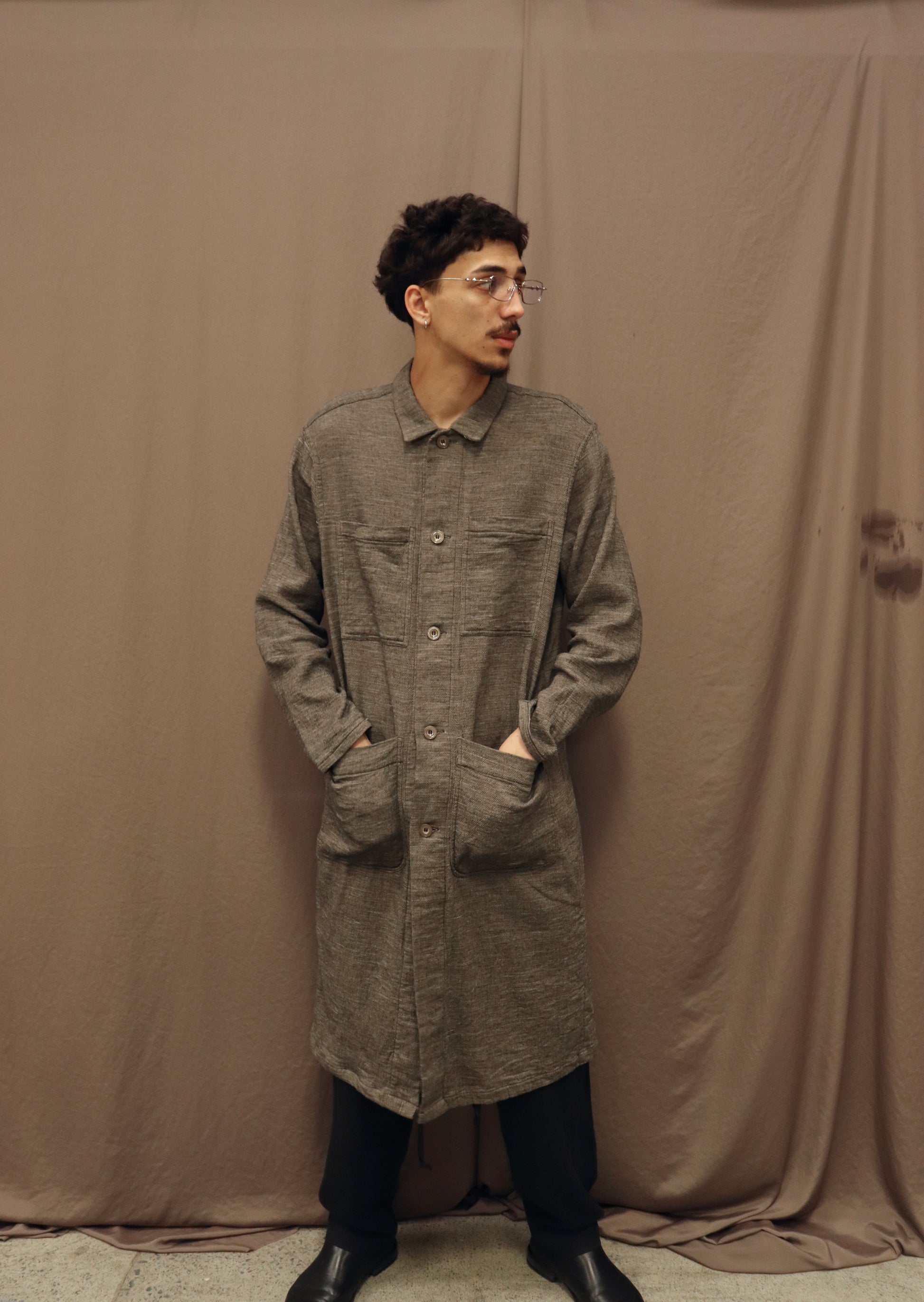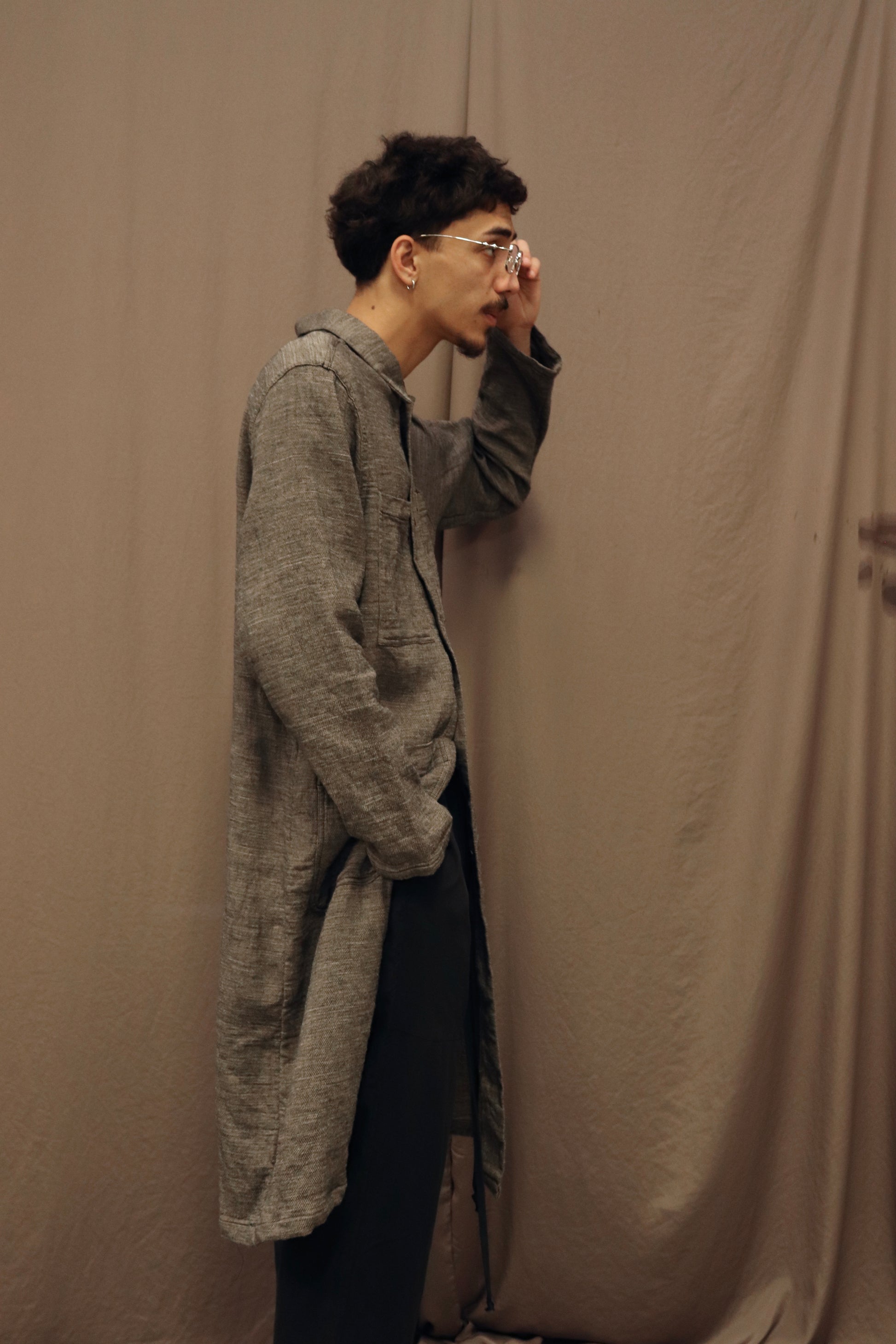Thoughtfully designed elongated duster coat. Crafted with a practical working collar, it offers versatility in wear while maintaining a soft silhouette. Large patch pockets provide ample storage without sacrificing the coat’s streamlined appearance, making it ideal for daily use. The back features an opening vent that enhances mobility and breathability. The coat is fabricated in a chambray style medium weight linen offering structure whilst holding a raw-like texture.