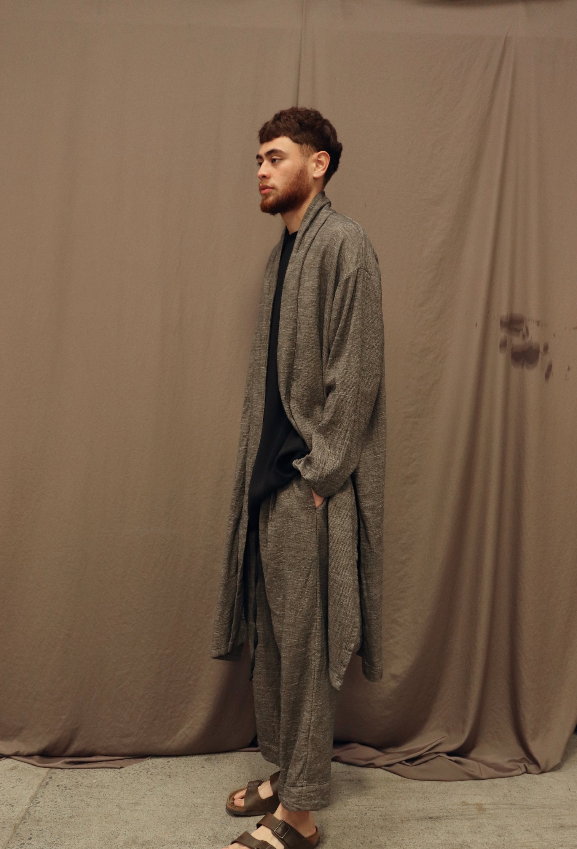 Wide legged, cropped pants, featuring an elasticated waistband for easier sizing opportunity. Built with large pleats and black linen drawstring. The pants are fabricated in a chambray style medium weight linen offering structure whilst holding a raw-like texture.