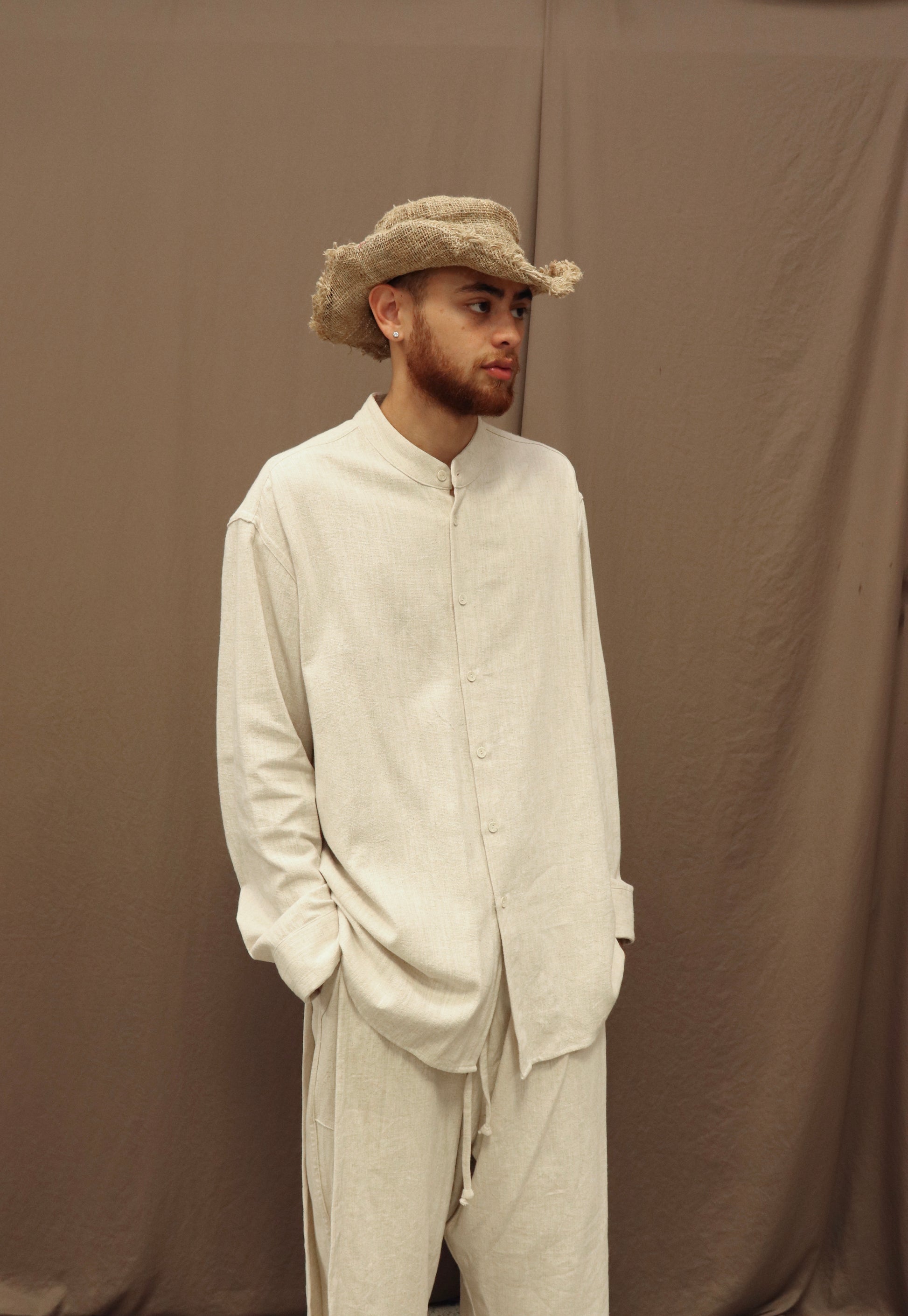 A classic cut, timeless shirt, shaped with a collar stand and built with a shoulder yoke, back, and cuff pleats, is crafted from softly textured, raw undyed linen.